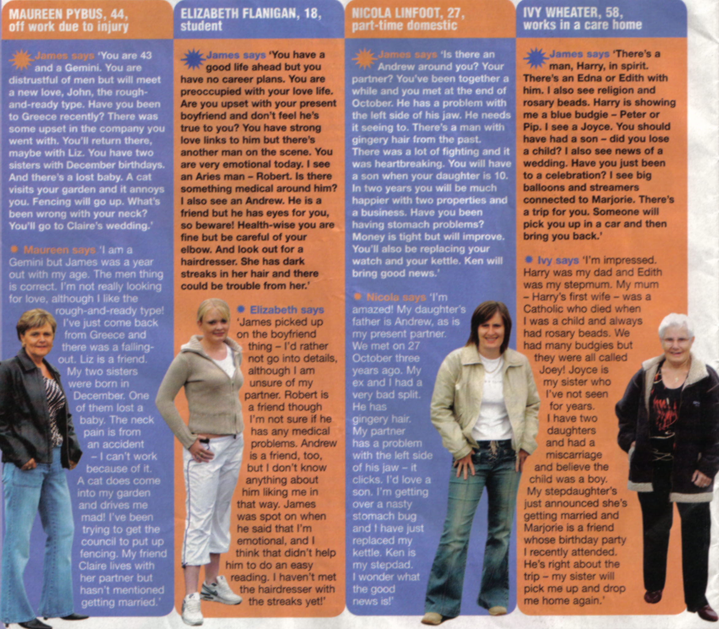The very first reading I had with James, he told me I had been sexually harassed at work, and I had. James also told me I had a sister in spirit and said that she would have had her 21st Birthday that year. I was stunned because I didn't know my mother had a miscarriage. After the reading I confirmed this with my mother and she was shocked because only my mother and father knew.